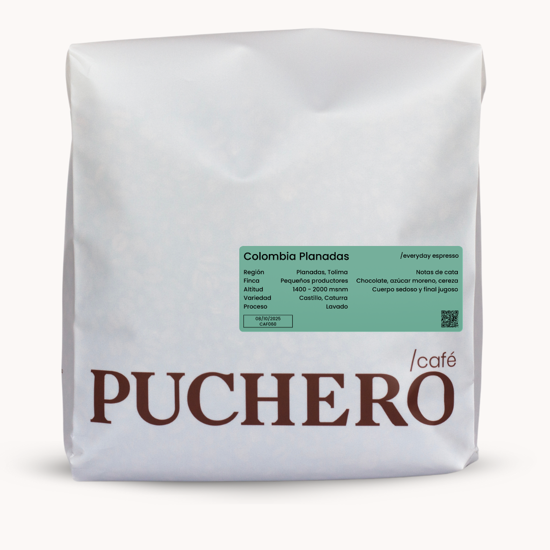 Es un café de larga temporada. Ampliamos la carta de Puchero, ofreciendo, en este caso, un /everyday espresso más. Esta vez hemos seleccionado este café de origen Colombia. Es un café muy dulce, por su genética, que mezcla variedades como Tabi, Caturra y Castillo, por la zona donde esta cultivado, de altura, por la riqueza de sus suelos y vegetación, al estar cultivado bajo arboles de frutales y carboneros. Este café cuenta con denominación de origen Tolima.